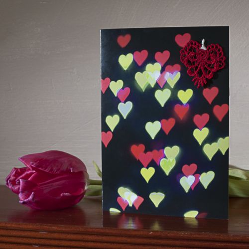 Teaming up with Nottingham lace jewellery maker JC Middlebrook, one of her beautiful lace heart ornaments in red is on each card. The image on the card is a photograph where I made a stencil of a heart shape which goes over the lens and then I photographed some lights, resulting is this beautiful and vibrant array of hearts.